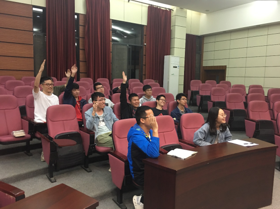 第三个部分,支部书记对余老师的培训进行了简要总结,并根据余老师的培训内容进行有奖竞答,以检验学习成果,竞答方式为抢答积分制。有奖竞答题目围绕党章,党史,以及十九大内容,大家表现十分活跃,正确率也很高,最后积分靠前的五位同学获得了奖品。