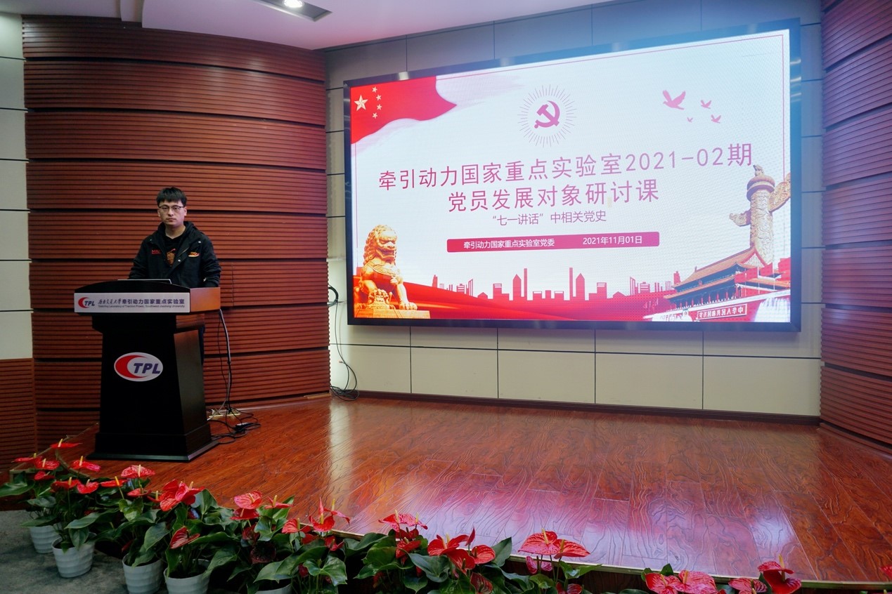 11月01日下午14时30分,牵引动力国家重点实验室2021-02期党员发展对象专题研讨课于牵引红楼218会议室召开。会议由牵引实验室专职组织员李向蔚老师、2019级研究生辅导员田容博主持,实验室本期全体党员发展对象参加。研讨课围绕习近平总书记“七一”重要讲话中相关党史展开,共同学习了习近平总书记此次重要讲话精神以及中国共产党的光辉历史。