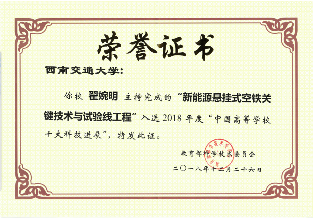 翟婉明院士出席会议并领取2018年度“中国高等学校十大科技进展”奖项。翟婉明院士主持完成的“新能源悬挂式空铁关键技术与试验工程”,经过地方和高校遴选、部门形式审查、学部初评、专家综合评议和公示5个阶段,成功入选,这是翟婉明院士主持的研究成果第二次入选,上一次入选是在2005年,即为他的车辆-轨道耦合动力学理论研究成果。