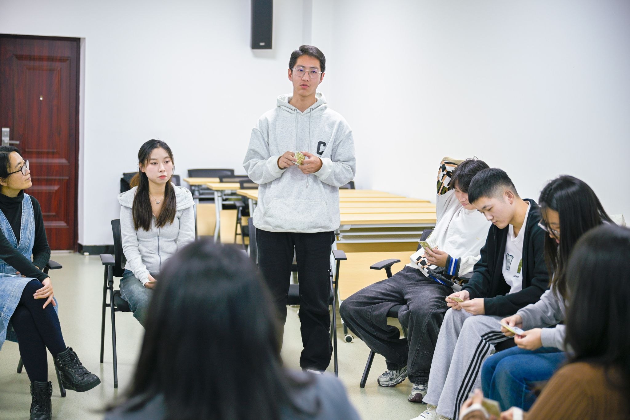 活动伊始,通过破冰游戏快速打破同学间的陌生感,营造出开放包容的互动氛围,并让同学们结合卡牌意象进行自我介绍,分享对职业的初步想法与参与活动的初衷,为后续探索奠定基础。