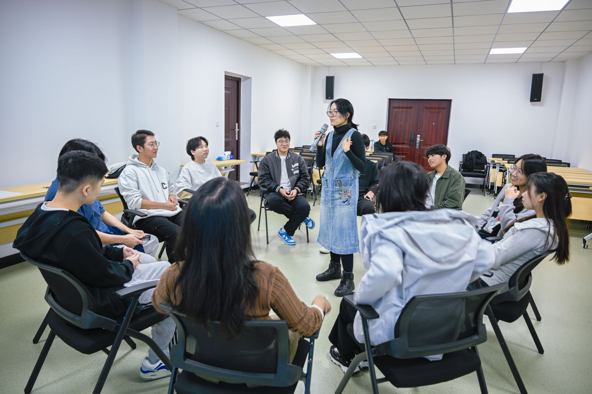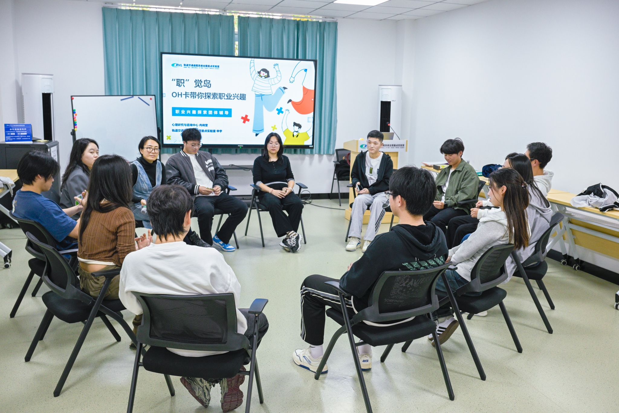 在B1楼209开展职业兴趣探索团体辅导活动。活动由学校心理研究与咨询中心冉俐雯、实验室心理工作专项负责人申宇共同带领,轨道运载2025级硕士1班13名同学参与。