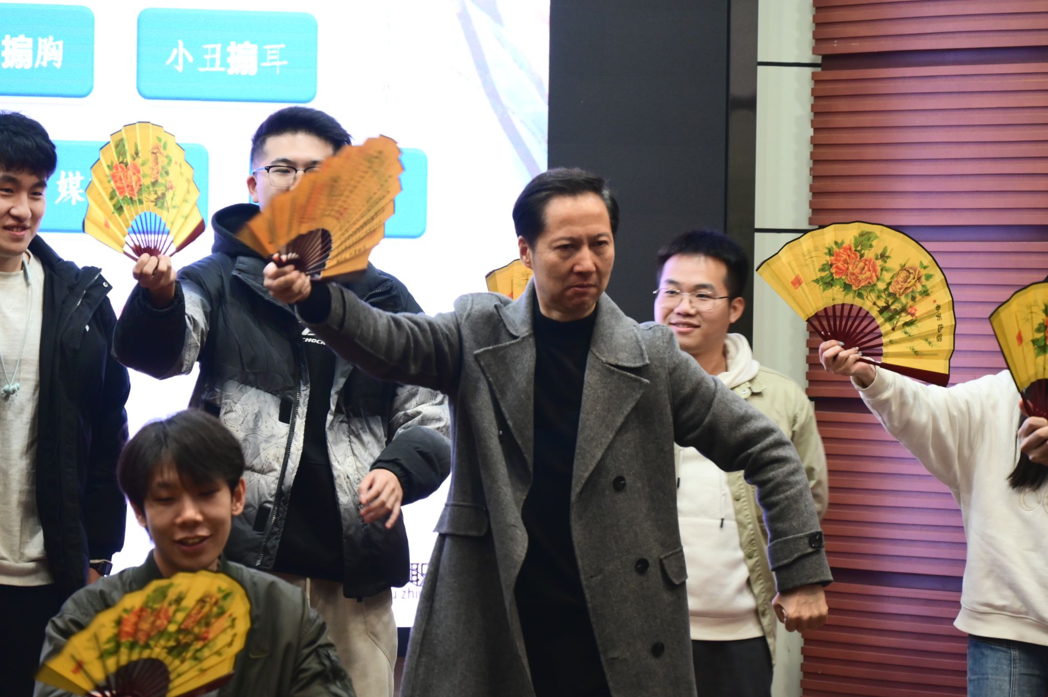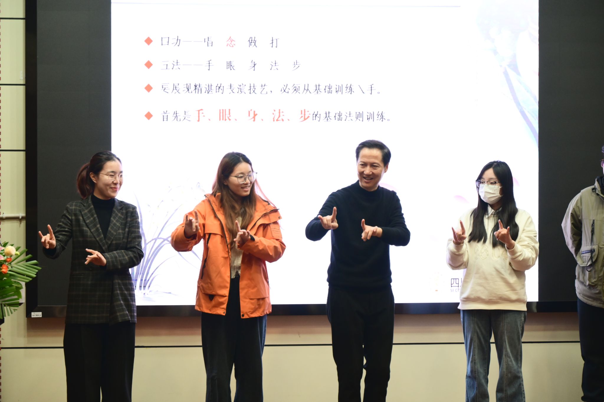 在互动体验环节,肖教授带领师生走进川剧的“台前幕后”,聚焦川剧表演基础,手把手指导大家练习指法、台步等核心动作。从眼神传情的灵动技巧,到身段舒展的韵律要领,肖教授耐心细致地逐一示范纠正,带领师生在亲身体悟中触摸川剧表演的精髓,深度感知传统艺术的文化内涵。