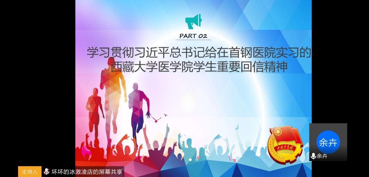 研究生之窗讯(通讯员 高程程 摄影报道)为响应校团委每学期一次团课培训要求和研究生院关于认真贯彻落实《中共教育部党组关于学习贯彻习近平总书记给在首钢医院实习的西藏大学医学院学生重要回信精神的通知》工作要求,在疫情期间不放松对团干部的培养,2020年3月18日,2019-2020学年第二学期集体团课以网上团课的方式顺利开展。本次团课由团委书记余卉老师主持,主要内容是:学习贯彻习近平总书记给在首钢医院实习的西藏大学医学院学生重要回信精神,实验室各类团干部共102人参加 。