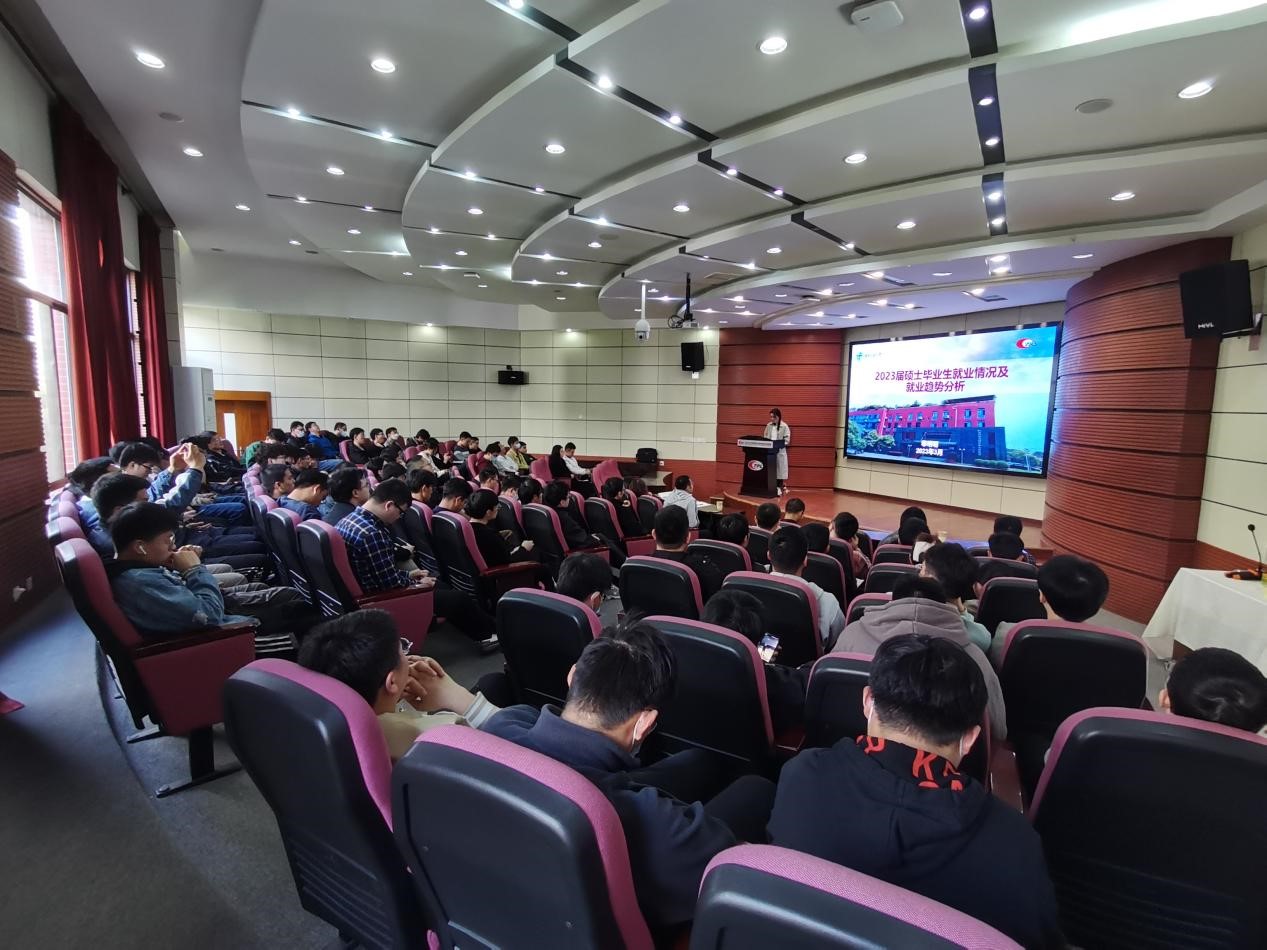 接着,辅导员奉明明对目前毕业生就业情况和就业形势进行了分析。奉老师结合用人单位发布的春招信息和我校春季校园招聘情况,介绍了就业形势以及校园招聘趋势,同时展示了牵引2023届硕士毕业生目前的就业具体情况,以此来帮助大家了解最新就业形势。