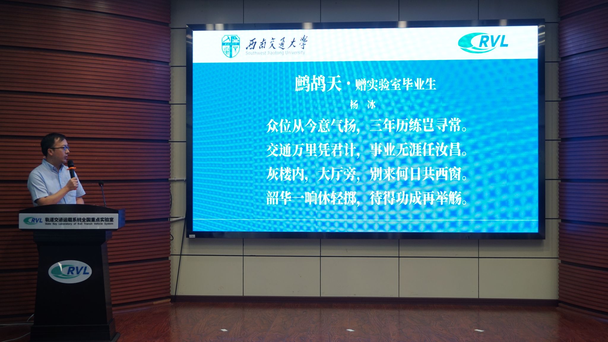 实验室党委书记庞烈鑫随后介绍了2024届毕业生整体概况,并勉励实验室毕业生践行“强国有我”的铮铮誓言,在未来的求学、工作路上秉承交大精神,不忘初心、砥砺前行,践行轨道运载学子的责任与担当。他还展示了翟婉明院士对于2024届毕业生的手写祝福语。