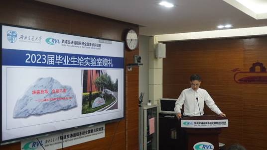 交流环节后,林川淇代表2023届全体毕业生向实验室赠送“景观石”作为礼物,景观石上书代表交大精神的八个字——“竢实扬华,自强不息”。他表示离别之际,赠送景观石代表着2023届轨道运载全体毕业生将铭记学校、实验室和师长的教诲,传承交大精神,不忘初心,砥砺前行。