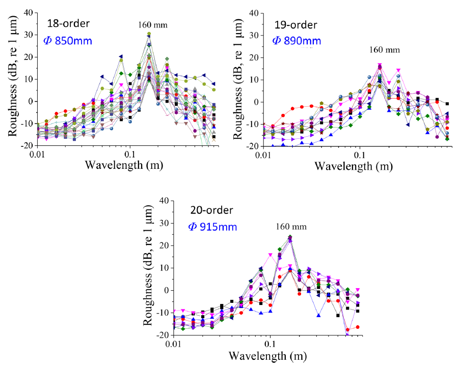 Fig. 11 Reduction of the polygonization order as the wheel diameter decreases, observed on a 350 km/h EMU running at speeds up to 300 km/h in 2015 and 2016. Each curve represents one wheel, and the wavelength is about 160mm.