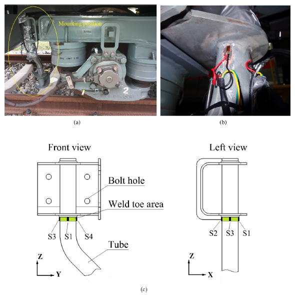 Fig. 1. Schematic diagram of strain test positions: (a) Installation diagram of lifeguard; (b) Strain gauge; (c) Test positions.
