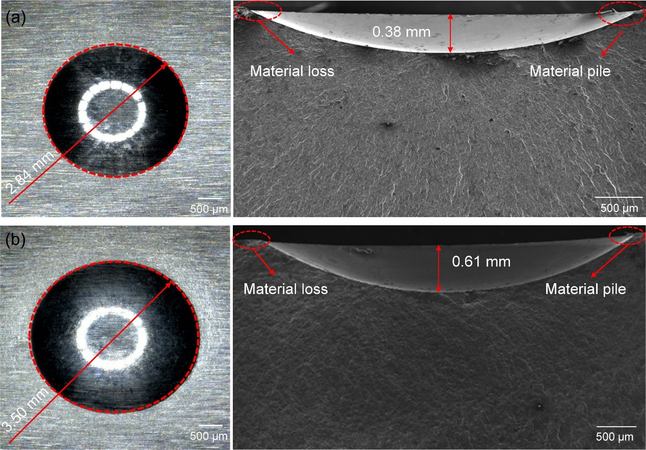Fig. 8. Dimple macroscopic morphology after the impacting: (a) 100 m/s, and (b) 138 m/s.