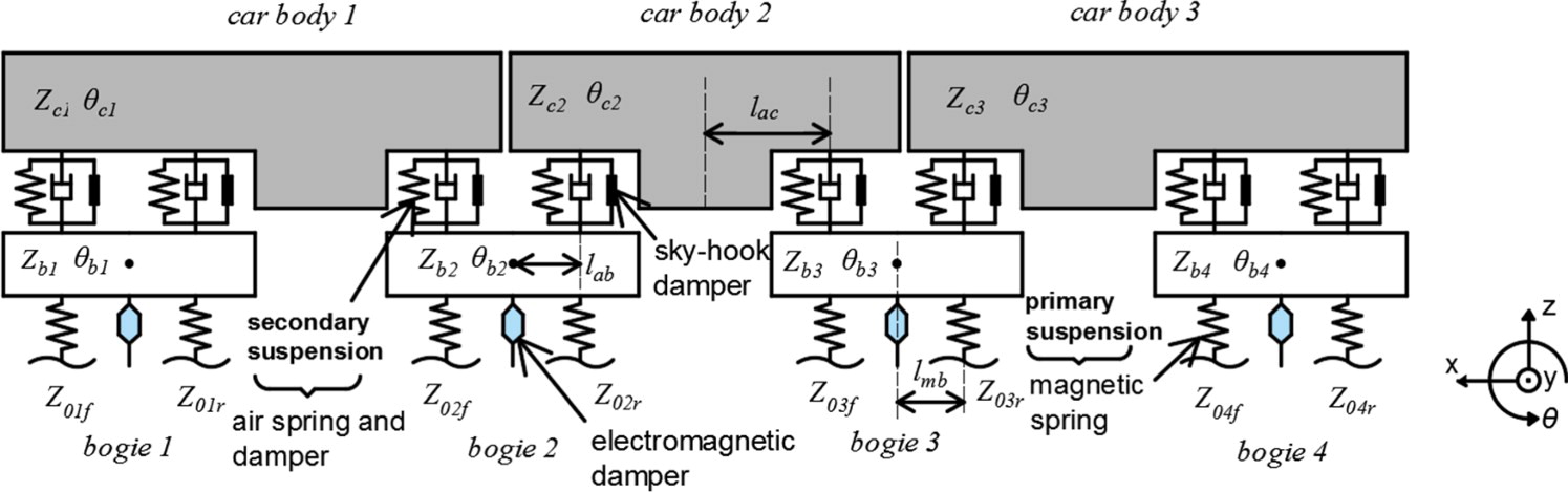Fig. 14. The 14 DOFs cooperative control model of the electromagnetic damping-ceiling damping for superconducting EDS train.