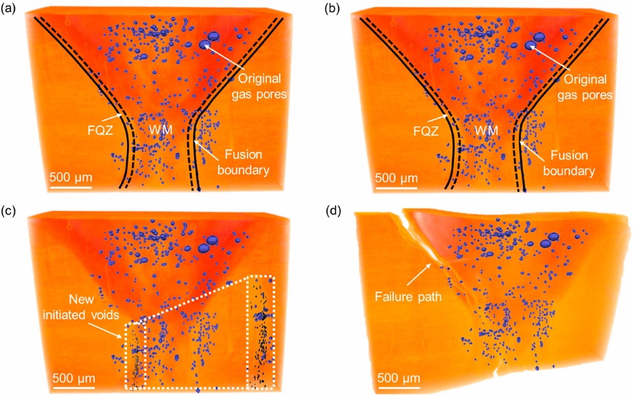 Fig. 11. 3D volume renderings taken from the μCT images for the tensile test piece loaded to (a) 0 MPa, (b) 210 MPa, (c) 344 MPa and (d) 375 MPa showing the original voids (rendered yellow) and the new initiated voids (rendered black – also shown in magnified inset). The black solid lines indicate the fusion boundary. The fusion boundary is approximated with reference to the weld macrostructure in the metallographic image. And the location of FQZ is outlined according to its nearly 100-μm wide feature. (For interpretation of the references to color in this figure legend, the reader is referred to the Web version of this article.)