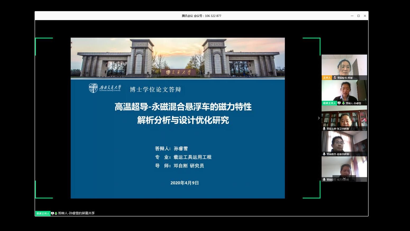 按照教育部、四川省教育厅有关通知要求和学校新型冠状病毒防控工作部署安排,根据《2020年春季学期疫情防控期间研究生教育教学实施方案》相关要求,2020年4月9日,牵引动力国家重点实验室举行首场博士研究生在线学位论文答辩,申请此次答辩的是孙睿雪博士,导师是邓自刚研究员。