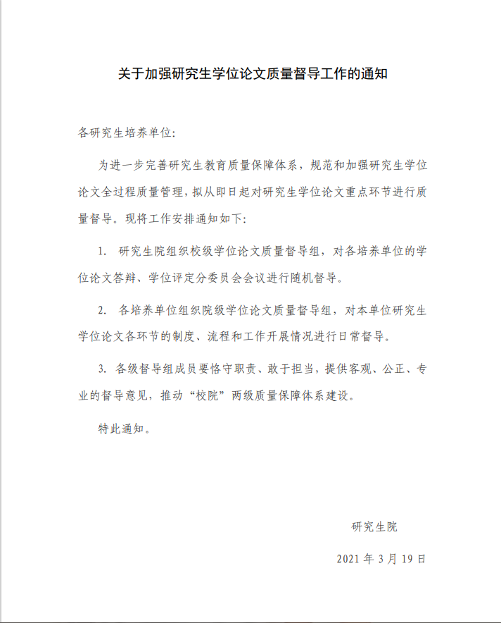转发研究生院《关于加强研究生学位论文质量督导工作的通知》