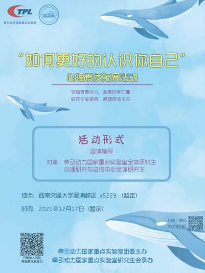 为积极响应学校阳光工程,培养实验室研究生健康人格。现实验室联合心理研究与咨询中心开展一次心理素质拓展活动,通过心理拓展活动宣传心理健康知识,提高同学们心理承受能力,增强团队凝聚力,以更积极乐观的心态和更亲密融洽的关系投身到生活和学习科研中去。因团辅名额有限,欢迎大家尽快报名。