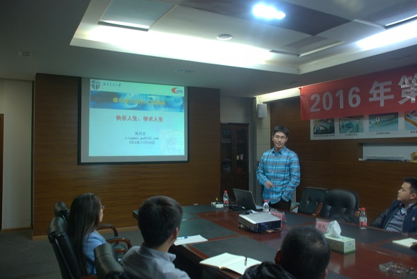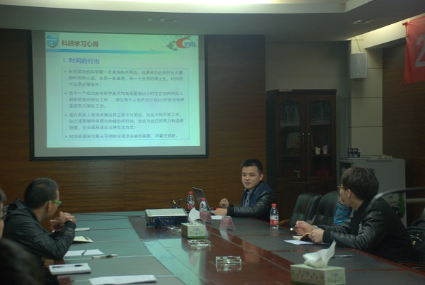 首先,开场主持人黄兆国简要介绍了到场的两位主讲人,在场响起了热烈的掌声。随后,朱胜阳博士讲述了自己硕博期间和海外期间的经历,对在座的研究生们做了很多建议,比如在科研道路上如何坚持克服重重困难,出国留学会有哪些需要注意的方面等等。接着,吴兴文博士结合自己18个月的海外科研经验,拿出自己的论文稿件向大家讲解写作,并指出各个需要注意的地方和细节。两位博士还和在场研究生讨论了科研以及生活上有趣的事情,分享了他们在的遇到的各种各样的经历与问题,以及当时的心态变化,如何在逆境中寻找到正能量,如何学会在压力中释放自己等。整个会议气氛轻松而热烈。