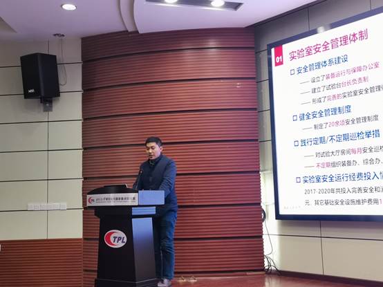 首先,副主任敬霖分别从实验室安全管理体制、实验室安全培训与教育、实验室危险源管理、实验室安全设施与防护配置、实验室安全检查与隐患整改等五个方面对实验室的安全管理工作进行了汇报。
