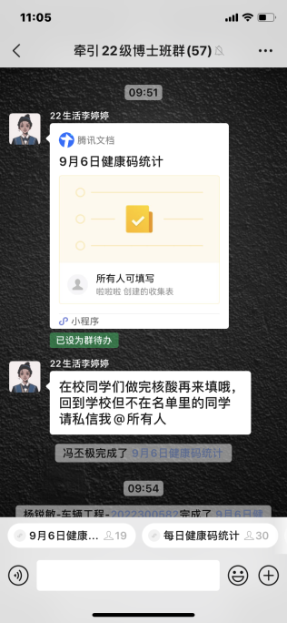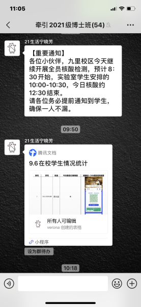 此次疫情防控要求全市范围内开展全员核酸检测,初期人员具体情况的摸排,每日核酸检测督促就变得尤为重要。为此,实验室在全体研究生班级中设置由“班级网格员”,由生活委员和班长配合担任“班级网格员”,开展防控工作。“班级网格员”们利用腾讯在线文档小程序等工具,每日在指定时间内对实验室25个班级600余名在校研究生开展基本信息、健康码信息、核酸检测信息三个板块内容进行摸排。摸排结束后,班级汇总上报各自辅导员老师,再由辅导员进行汇总上报党委学工部。力求及时掌握600余名研究生的基本情况,并以此督促全体核酸检测情况。利用这种方式,实验室连续三天核酸检测都能做到在核酸检测结束时就完成100%,个别红黄码学生在健康码出现问题的第一时间就能及时前往指定隔离点,避免出现疫情防控的漏洞。